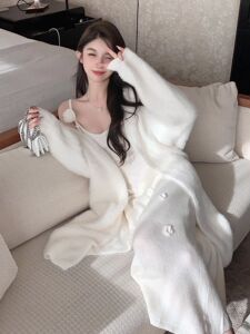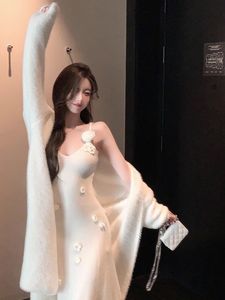 秋冬穿搭温柔风高级白色名媛吊带连衣裙长款显瘦毛衣裙套装两件套