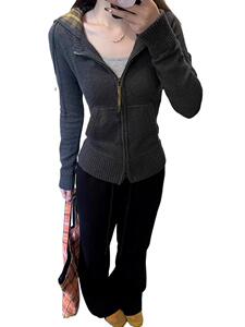 连帽针织毛衣开衫外套女美式复古格子拉链短款修身韩系春秋冬上衣
