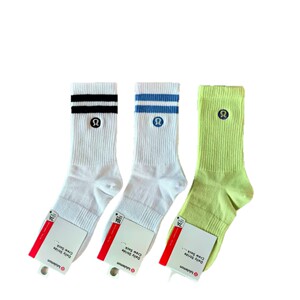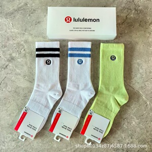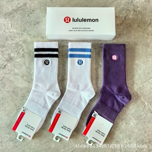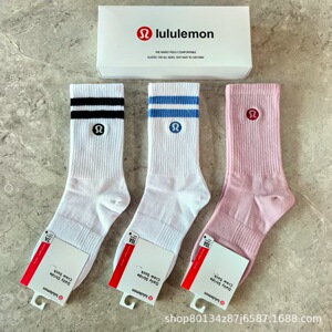 新款刺绣lulu露露袜子男女情侣四季款黑白健身跑步运动中高筒批发