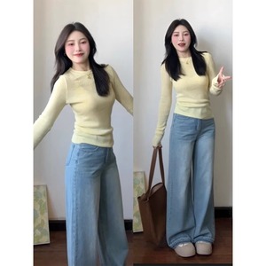 早秋穿搭黄色圆领内搭针织衫女长袖修身毛衣显瘦独特打底衫上衣潮