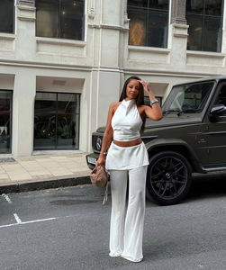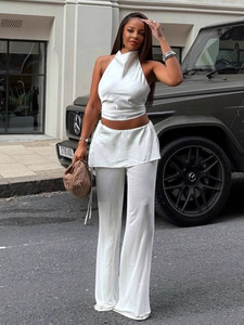 欧美秋季新款女装气质纯色挂脖无袖修身上衣齐腰假两件长裤套装女