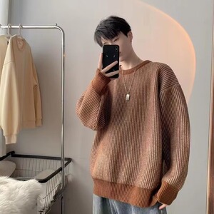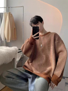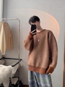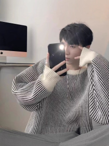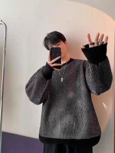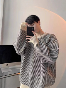 条纹圆领毛衣男秋冬季港风潮牌青少年套头毛衫衣宽松慵懒风针织衫
