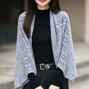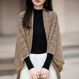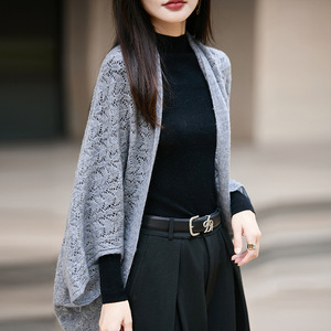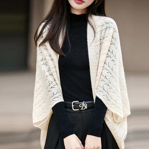 批发100羊毛披肩秋冬新款镂空开衫斗篷女宽松韩版百搭毛衣外套女