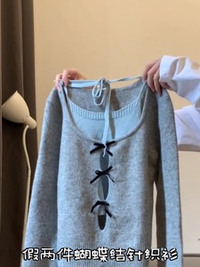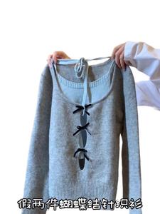 小心机蝴蝶结针织假两件上衣春拼接撞色纯欲风修身吊带长袖打底衫