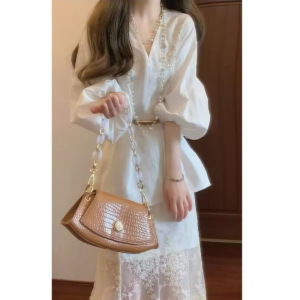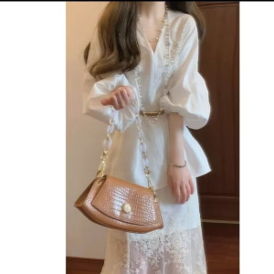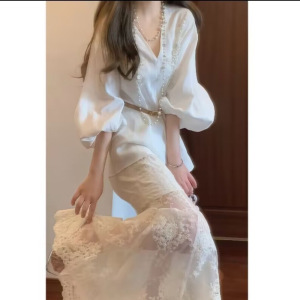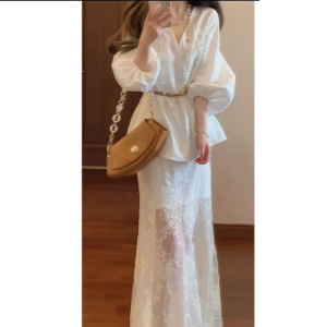 2025秋季新中式国风巨好看V领灯笼袖上衣&网纱鱼尾半身裙套装女装
