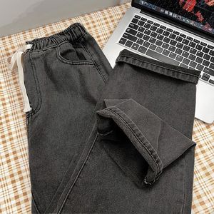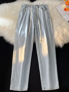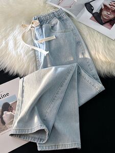 直筒牛仔裤女秋冬小个子松紧腰阔腿宽松学生浅色新款老爹裤子