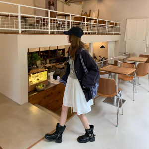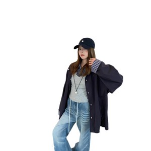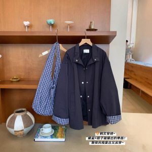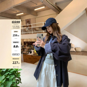 宋正恩藏蓝色格子拼接外套女秋季2025新款韩里韩气的宽松大版上衣