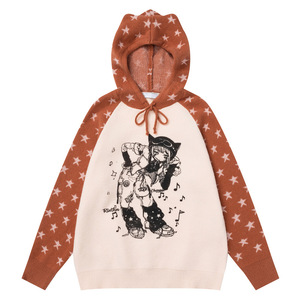 衣品男装轻亚风人物印花撞色连帽毛衣女秋冬宽松慵懒针织上衣外套