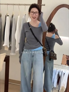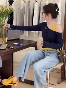 韩系撞色假两件斜肩长袖t恤女早秋内搭小个子纯欲风露肩打底上衣