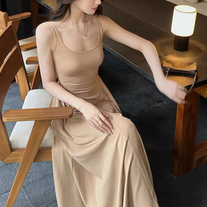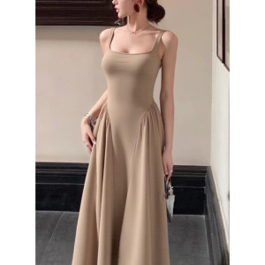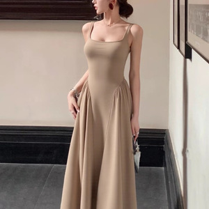 JUEMEI 温柔法式气质方领吊带连衣裙高JI感收腰显瘦A字大摆长裙女