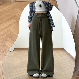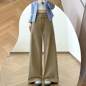 卡其色设计感牛仔裤女2025秋新款韩系抽绳高腰垂感直筒休闲阔腿裤