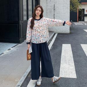 实拍韩版减龄撞色拼接碎花衬衫套装2025秋款甜美休闲阔腿裤两件套