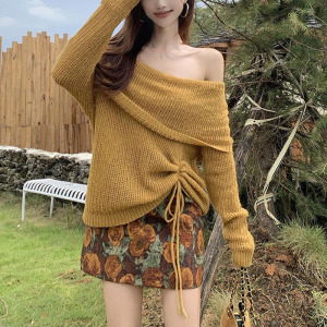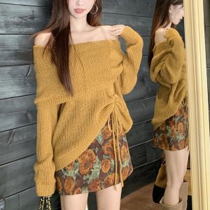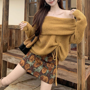 美拉德一字肩长袖针织衫碎花半身裙短裙女2025秋季新款时尚两件套
