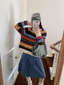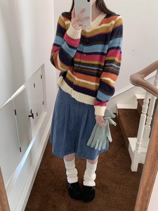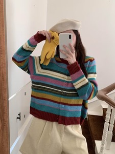 韩系减龄多巴胺彩条圆领毛衣开衫女文艺感休闲百搭针织衫外套上衣
