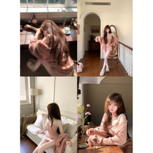 巨好看的早秋ootd穿搭一整套粉色毛衣开衫条纹吊带连衣裙两件套装