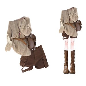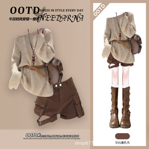 早秋季2025超火穿搭一整套美拉德废土风针织衫西部牛仔短裤两件套