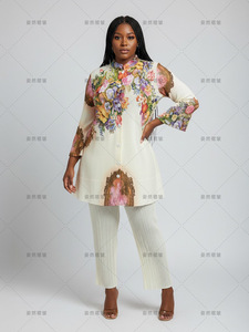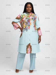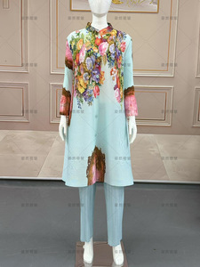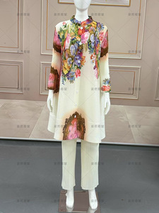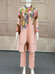 非洲大码秋季套装气质女装高级感三宅褶皱印花裤子上衣休闲两件套