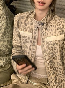 '豹纹限定'小众做旧定染豹纹印花立领外套女秋棉氨纶翻领常规袖