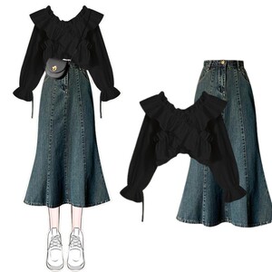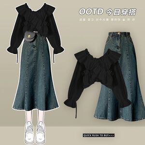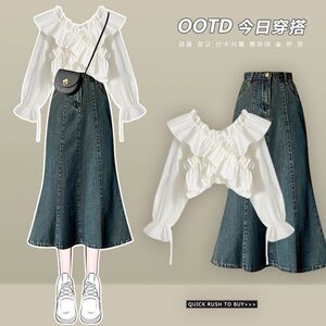 秋季套装女2025新款减龄穿搭设计感泡泡袖衬衫女牛仔鱼尾裙两件套