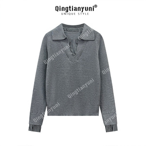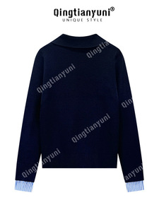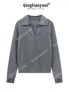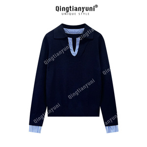V领撞色拼接长袖上衣女针织衫2025秋冬新款假两件高级感毛衣宽松