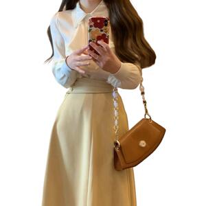 春季新款设计感蝴蝶结长袖衬衫+高腰显瘦半身裙时尚两件套装裙子