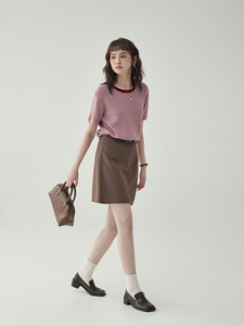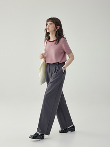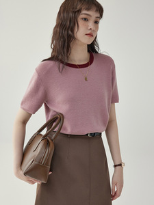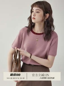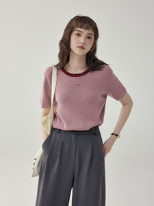 「北岛AMUU」减龄薄款圆领套头显瘦坑条针织t恤女夏打底短袖上衣