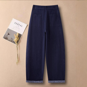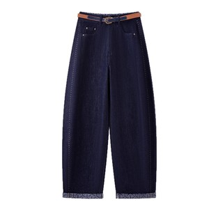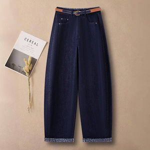 2025新款深蓝色天丝弯刀牛仔裤女早秋季高腰宽松九分气球裤配皮带
