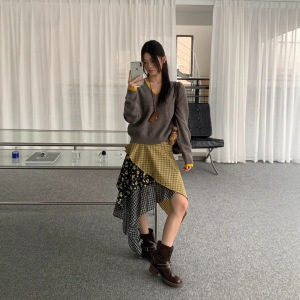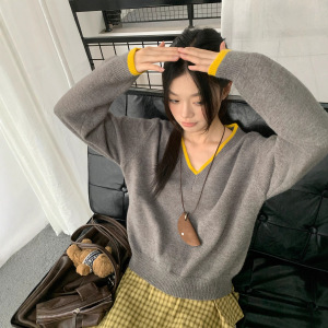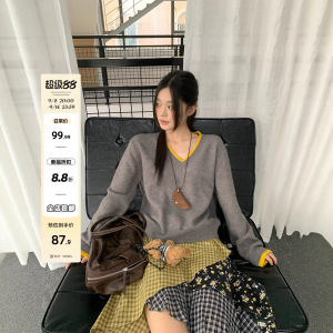 宋正恩撞色V领毛衣女秋冬2025年复古宽松内搭可外穿套头毛织上衣