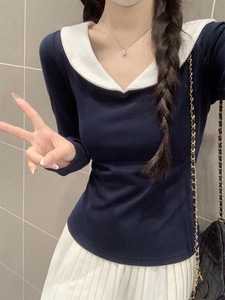 实拍秋季韩版设计感娃娃领正肩修身打底衫内搭长袖T恤女上衣88729