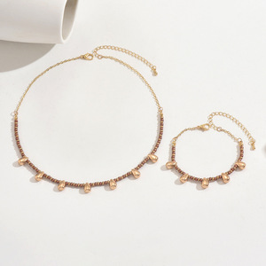 美拉德复古金色水滴形吊坠彩色玻璃串珠项链手链套装金色豆锁骨链