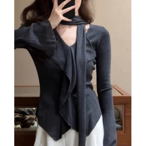 法式荷叶边飘带挂脖V领针织衫女早秋季穿搭不规则设计感内搭上衣