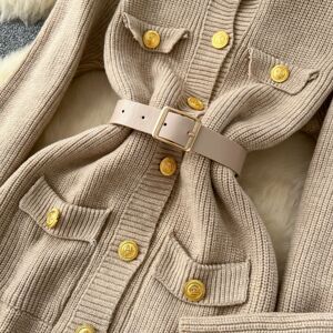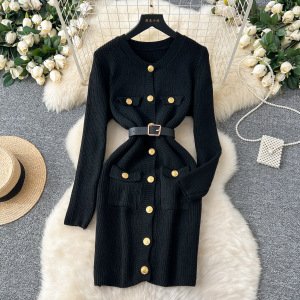 法式名媛小香风圆领金属扣开衫针织连衣裙女收腰内搭毛衣打底裙子