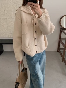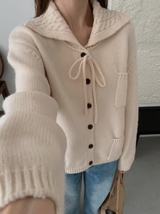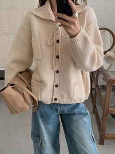 复古翻领系带针织开衫女2025秋冬新款韩系宽松休闲慵懒毛衣外套厚