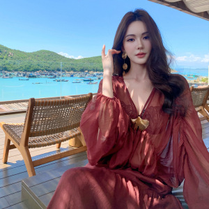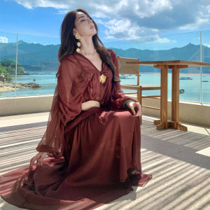 度假风v领长袖雪纺衬衫薄纱抽褶V领上衣早秋高腰垂感半身裙套装女