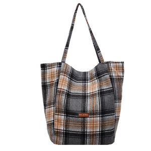 大容量单肩包购物袋百搭帆布包女秋冬新款日韩毛呢格纹背心包2025