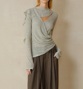 someone sometime 原创镂空麻交叉垂荡V领连身围巾领喇叭长袖上衣