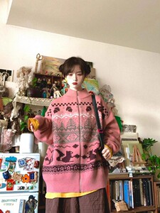 美式复古立领提花开衫毛衣秋冬费尔岛情侣针织衫外套