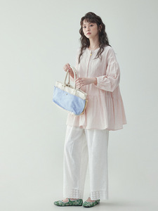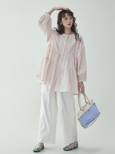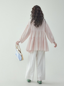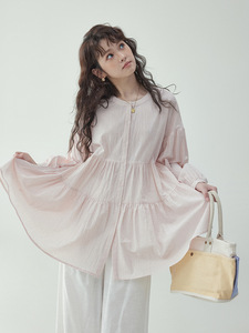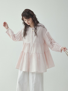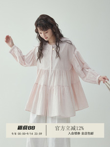 「北岛AMUU原创」甜美粉色圆领中长款衬衫女秋季新款宽松百褶上衣