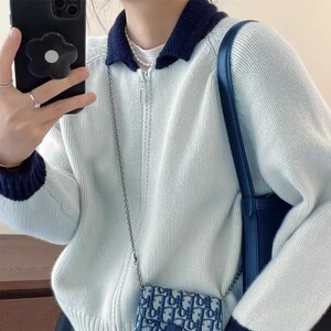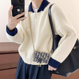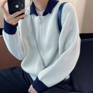 2025秋冬新款100羊毛针织开衫女拼色翻领拉链毛衣外套宽松上衣