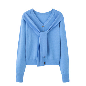 2025冬季新款时尚蓝色带披肩V领针织毛衣女开衫A1EDF417453