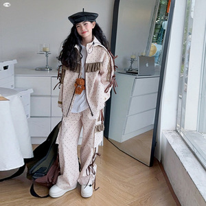 女童套装2025春秋装新款洋气中大童立体蝴蝶结波点外套工装裤两件