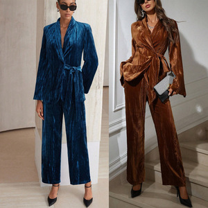 跨境欧美褶皱丝绒长袖长裤西装套装2025新款系带松休闲两件套装女