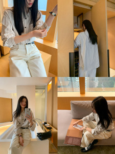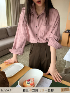 你好卡农 韩系雾面感条纹衬衫女春季新款宽松设计感长袖粉色衬衣