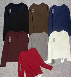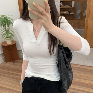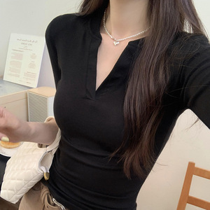 漂亮V领修身辣妹薄T恤女初秋新款美式高级感长袖chic上衣