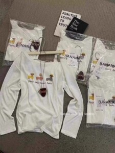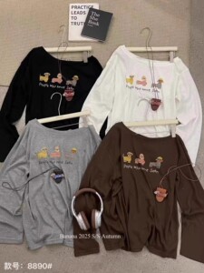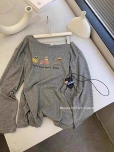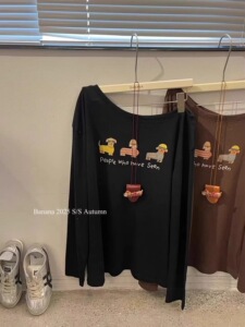 韩国东大门早秋新款韩版宽松慵懒趣味狗狗印花斜肩长袖T恤上衣女
