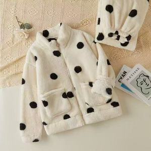 睡衣女秋冬新款法兰绒家居服珊瑚绒加厚波点拉链保暖衣套装可外穿