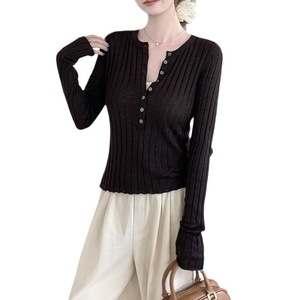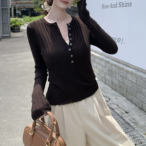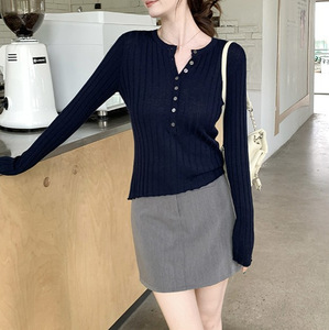 韩系灰色针织女秋季半开领纽扣气质正肩修身内搭上衣软糯坑条毛衣