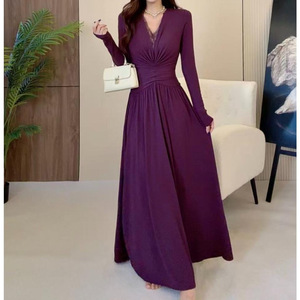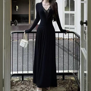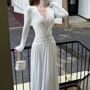 【蕾丝】2025春秋季新款显瘦遮肉收腰大裙摆V领长袖袖连衣裙