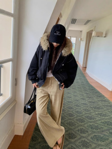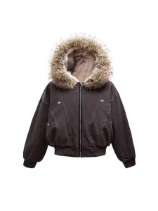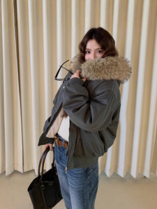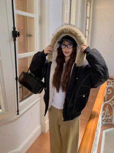 派克服短款羽绒棉服女仿兔毛大毛领连帽2025冬美式复古棉衣外套