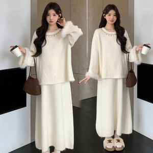现货2025秋季新款孕妇套装圆领喇叭袖+半身裙针织套装